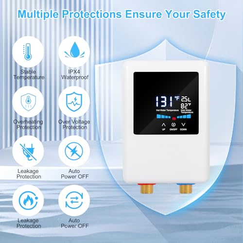 【SAFETY INTELLIGENCE RELIABLE】This under sink water heater electric has multiple protection features. ipx4 waterproof, leakage protection, dry burning protection, super mild and automatic power off in non-working condition. Tankless hot water heater with LCD digital display, intelligent detection of working status and performance to ensure safety.
